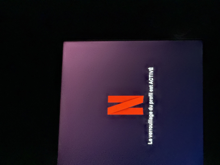 A digital display screen occupies the central and lower-left portions of the image, presenting a dark purplish-blue background. Centered on this background is the prominent red "N" logo characteristic of Netflix. Below the logo, white text in French reads "Le verrouillage du profil est ACTIVÉ," which translates to "Profile lock is ACTIVE." The screen is surrounded by unilluminated, dark areas, indicating a dimly lit or dark environment surrounding the display. No individuals, specific objects other than the screen, actions, or interactions are visible. The scene is located in the city of Dobrich, Bulgaria.