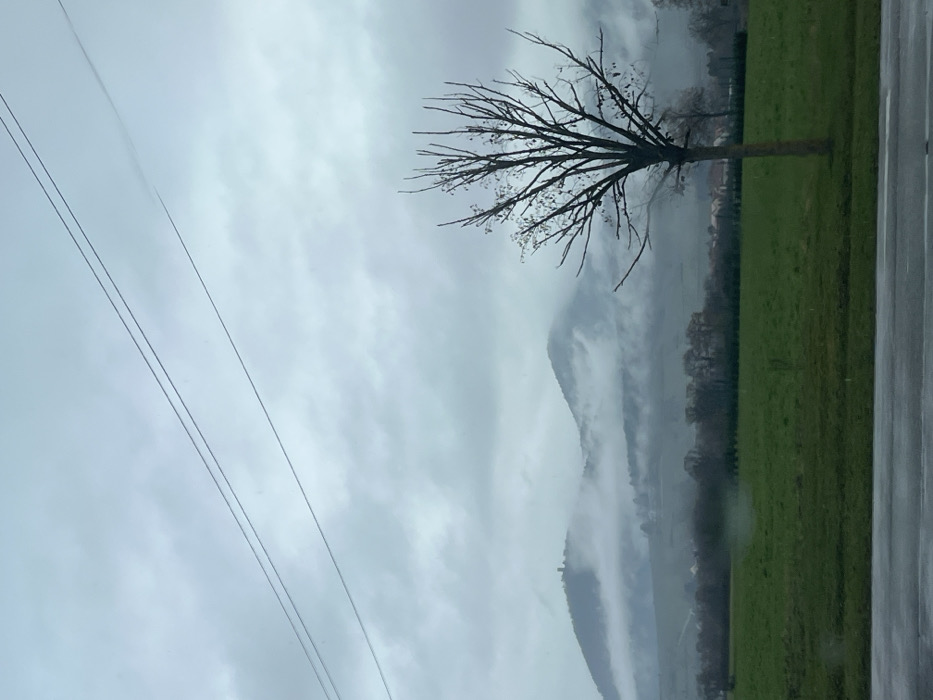 The image displays a landscape in the region of Ribeauvillé, France, under an overcast sky filled with low-hanging gray clouds and fog. Two parallel utility lines are visible diagonally across the upper left portion of the sky. The foreground features a wet, dark asphalt surface, likely a road, with a faint horizontal white line near the bottom edge. A vibrant green field occupies the mid-ground, and on its right side, a solitary deciduous tree stands bare of leaves. Beyond the field, a line of dark, bare trees forms a horizontal band, behind which a cluster of buildings with reddish-brown roofs is visible. In the background, two hills or mountains are partially obscured by mist. The summit of the left-most hill distinctly shows a dark, prominent structure consistent with a castle ruin, such as Château du Girsberg. No people or animals are present in the scene. The overall environment suggests a damp, cool, or wintry day.