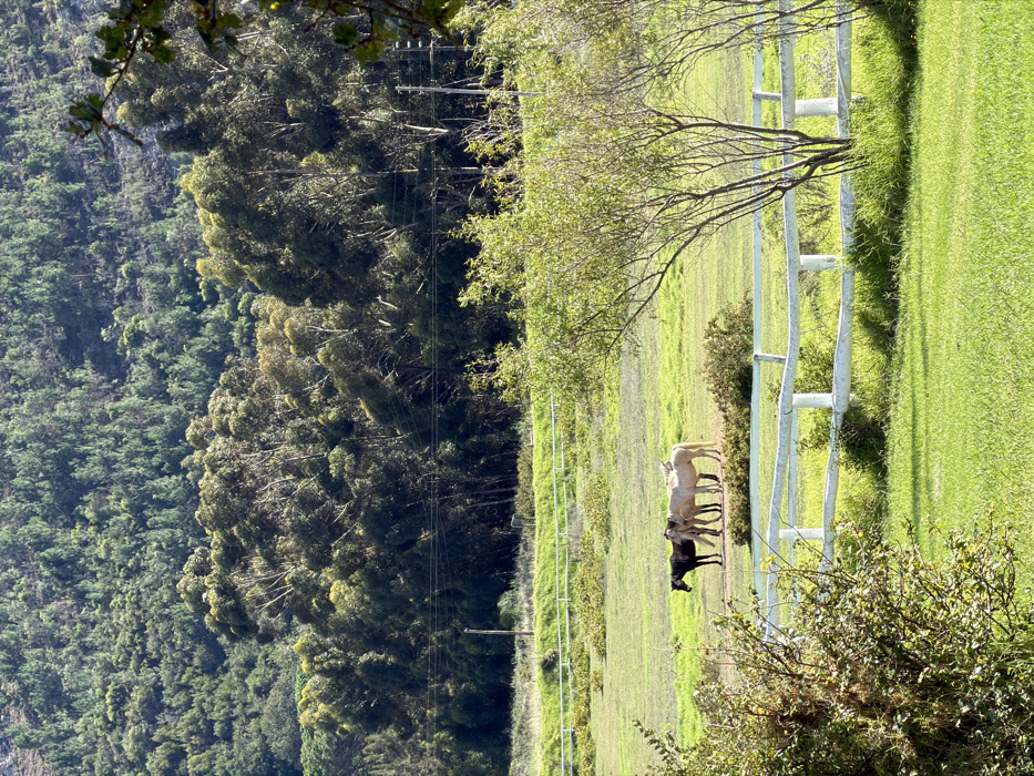 The image displays a rural landscape in Overstrand Nu, South Africa, illuminated by bright daylight. The foreground features vibrant green grass with scattered low-lying shrubs. A weathered white wooden fence, constructed with horizontal rails and vertical posts, spans the lower-mid portion of the frame. Beyond this fence, a green pasture is visible, containing four horses. One dark-colored horse stands to the left, while three lighter-colored horses are grouped closely together to its right. A second white wooden fence segment is present further back within the field. In the upper mid-ground, a grassy embankment supports a single utility pole with multiple horizontal power lines. The background consists of a densely forested mountain or hill, characterized by extensive green foliage of various trees. No people are visible; the horses appear stationary in the field.