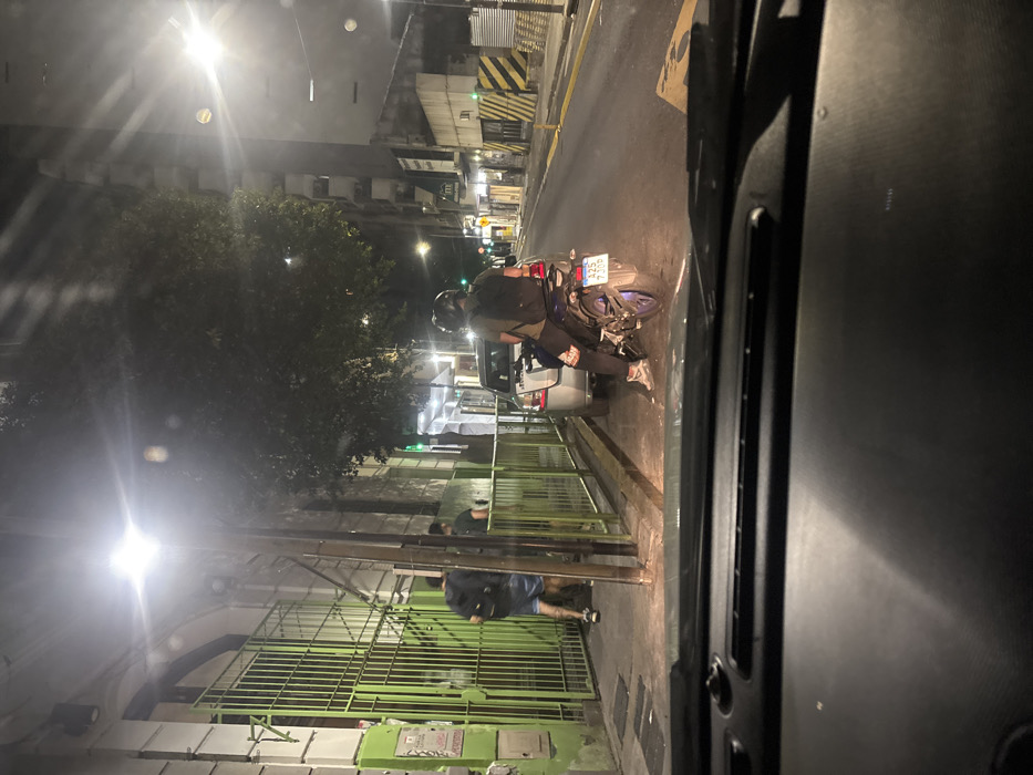 A nighttime street scene shows a motorcycle stopped behind a parked car. The rider, wearing a helmet, is standing next to the bike. A person is on the sidewalk near a green metal gate. Streetlights illuminate the area, creating a hazy effect. The view is from inside a vehicle, with the dashboard visible in the foreground. Yellow and black striped barriers are seen further down the street.