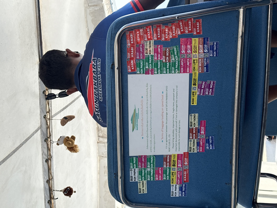 n interior view from a passenger's perspective on a speed boat, likely operating from Ban Ao Nang, Thailand. In the foreground, the back of a blue boat seat is prominently displayed, adorned with numerous colorful destination stickers including "SATUN," "KOH PHIPHI," "KOH PHUKET," "KOH LANTA," "KOH MOOK," "KRABI," "KOH YAONO," "KOH LIPPE," "KOH NGAI," and "KOH YAOYAI." Centered on the seat back is a white laminated sign, printed in both Thai and English, detailing "Terms of baggage loading on speed boat" and identifying the operator as "SATUN PAKBARA SPEED BOAT CLUB CO., LTD." Beyond the seat, a male individual is visible from the back, wearing a blue collared shirt with the "SATUN PAKBARA SPEEDBOAT CLUB" logo printed in white and red across the shoulders. His hair is dark and short. Above him, a white canvas canopy stretches across the top of the boat, supported by a metal frame. Hanging from this frame are decorative items: a small brown plush coconut, a light brown plush animal (possibly a squirrel), and a dark brown, boat-shaped or slipper-shaped plush. A pair of dark-lensed sunglasses is also hooked onto the canopy frame. The overall scene indicates preparation for or ongoing maritime travel.