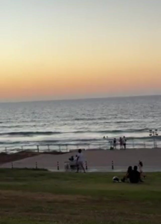 The video depicts a beach scene at sunset. The sky transitions from light blue to orange near the horizon, where the sea meets the sky. The ocean has gentle waves rolling towards the shore. On a sandy area near the water, several people are standing or swimming. A few more people are seated on a bench along the beach. Closer to the camera, on a grassy area, a person is walking with a dog, and another couple is sitting on the grass. A child in a pink outfit is also present near the sitting couple.