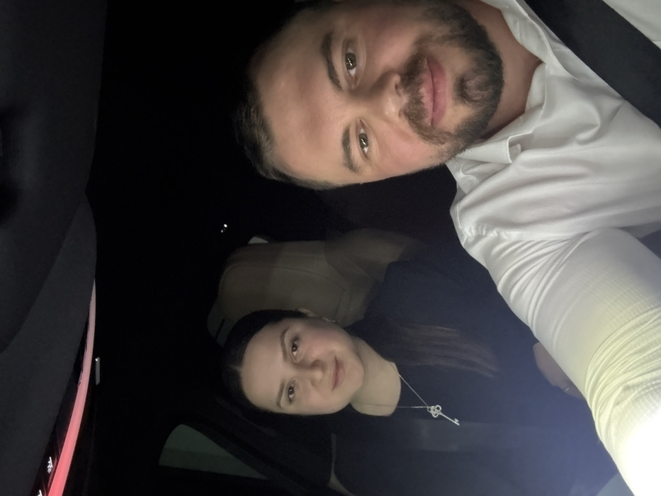 A selfie featuring two people inside a vehicle, possibly at night