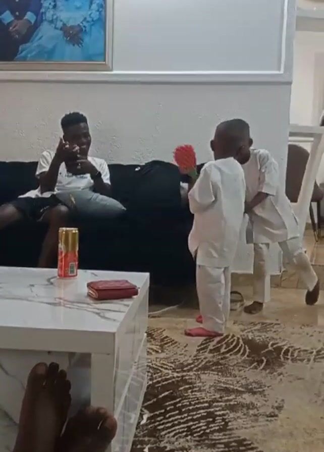 living room scene. A man in a white T-shirt and dark shorts sits on a black couch, looking at his phone. Two young boys, dressed in white traditional attire, are playing in front of him. One of the boys holds a red flower bouquet. A white coffee table with a marble pattern sits in front of the couch, holding a can of soda and a red wallet. A photo hangs on the wall above the couch. The camera captures a pair of dark-skinned feet at the bottom of the frame. The room is carpeted with a dark and light patterned rug.