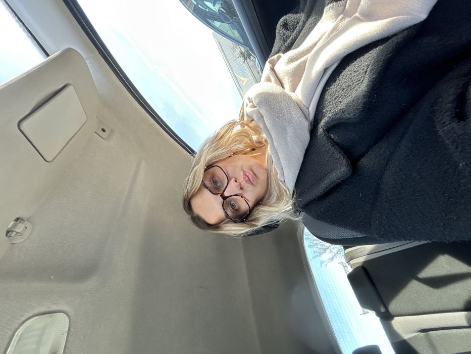 The image displays an individual seated in the passenger seat of a vehicle, located in Veauche, France. The subject has blonde hair and wears large, brown tortoise-shell frame glasses. They are dressed in a black textured coat and a light beige scarf, wrapped around their neck. The individual's lips are pursed in a pout, and they look directly at the camera. The interior ceiling of the vehicle is light grey/beige. Bright sunlight enters from the right side of the frame. Through the passenger side window, a clear blue sky with a faint contrail is visible, alongside the upper section of a building featuring a light roof and a partially visible yellow and black logo, indicative of a Lidl supermarket. This identifies the location as the parking area of the Lidl store at Rue du Crêt de la Courelle, 42340 Veauche. Through the rear window, sparse, bare tree branches are visible against the blue sky.