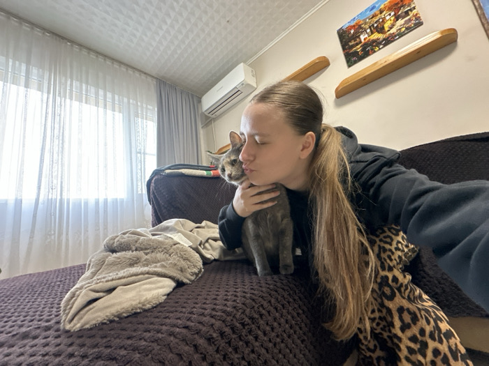 This image depicts an indoor residential scene in Tutrakan, Bulgaria. A female individual is shown embracing and kissing a domestic cat. The female, visible from the upper torso, has light-colored hair tied in a ponytail and is wearing a dark hooded sweatshirt. Her eyes are closed as she leans to kiss the grey-furred, short-haired cat, which is held in her left arm/hand and is positioned on a dark brown textured couch or sofa. A light-colored, fluffy blanket is draped on the couch to the left of the cat. A leopard print blanket is partially visible on the couch to the right of the female. In the background, a large window covered with sheer white curtains is on the left. Above the window, a white wall-mounted air conditioning unit is visible. The wall also features two light wooden floating shelves and a framed painting depicting a colorful landscape. The ceiling has a white, patterned square texture. The scene suggests a moment of affection between a person and a pet in a domestic setting.