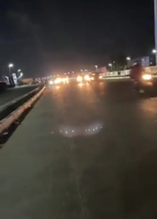 nighttime scene on a highway, likely in an urban area. Multiple vehicles with headlights on are moving in the distance. The road appears to be wet, reflecting the lights. Streetlights illuminate the road. There is a concrete barrier along the side of the road where the video is being filmed. The sky is dark. A person is visible standing on the left side of the road in the distance.