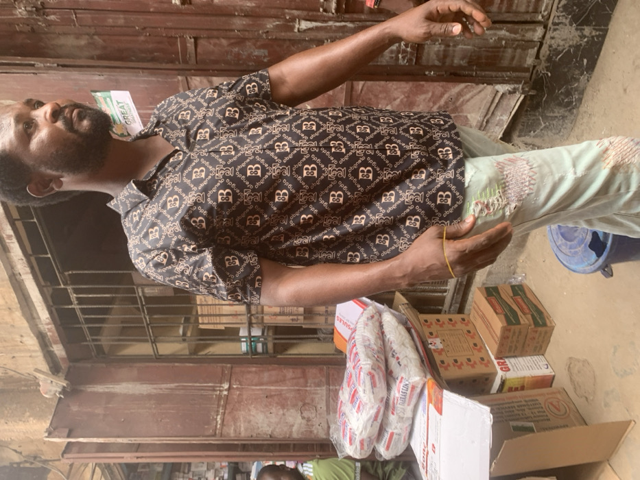 A man with a beard wearing a patterned shirt and light-colored pants stands beside a collection of boxes and packaged items. The boxes have varying labels, including brands and product names such as "GREAT" and "SULES." He is gesturing with his hands, and a yellow rubber band is visible on one wrist. The surrounding environment appears to be a shop or storage area.