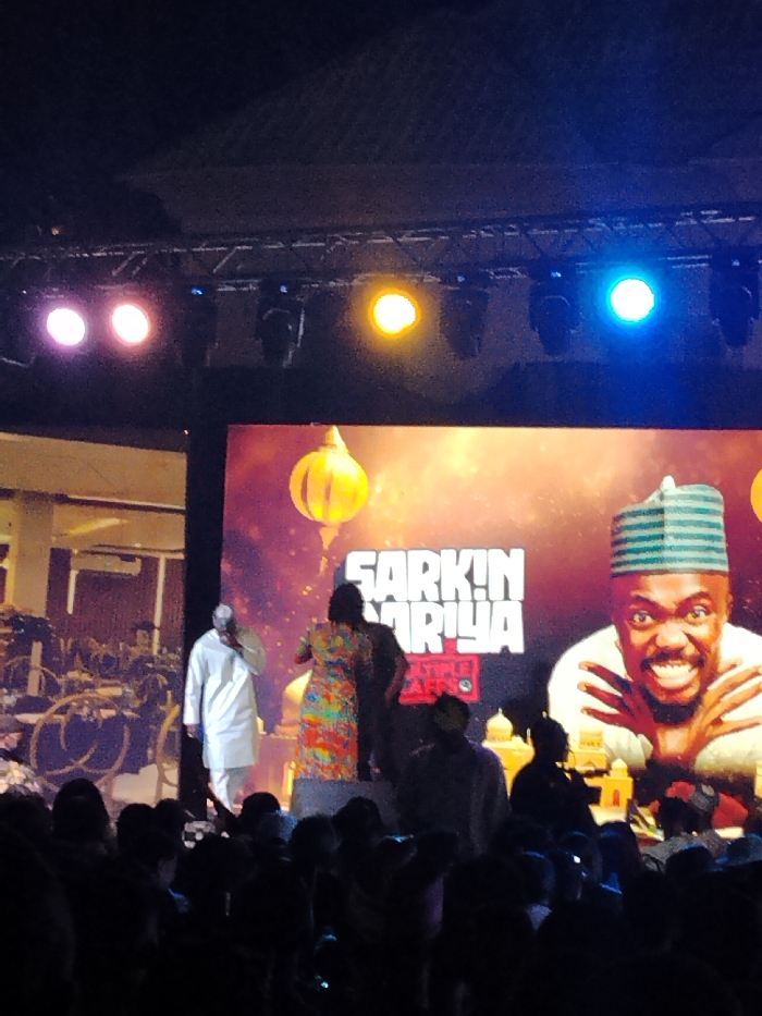 The scene depicts an indoor event occurring in Fagge D2, Nigeria, focused on a stage with a large video screen and a performing area