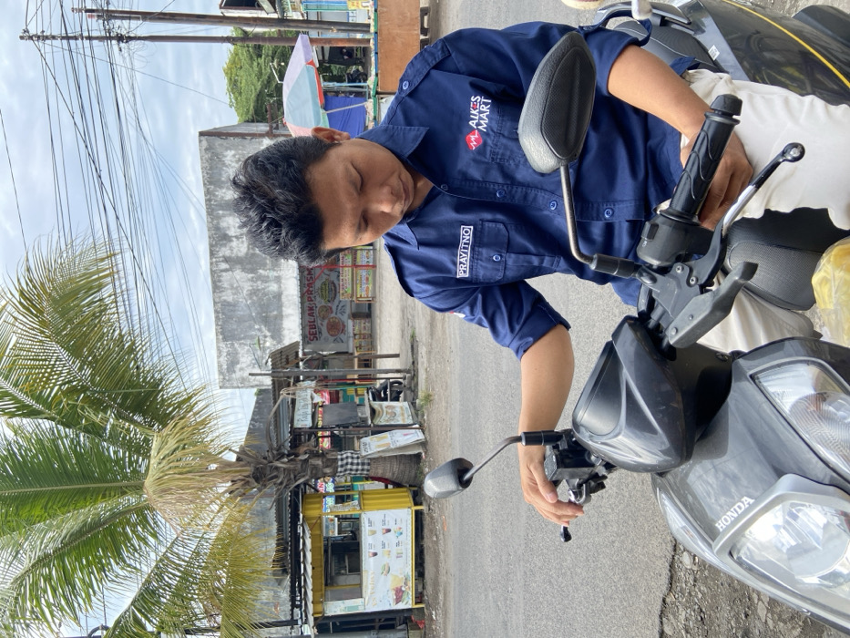 A male individual is observed seated on a black Honda scooter on a paved road in Balonggabus, Indonesia, under an overcast sky. He wears a navy blue short-sleeved collared shirt with the name "PRAYITNO" and an Indonesian flag patch on the right sleeve, and an "ALKES MART" logo on the left chest. His head is tilted downwards, his gaze directed at an unseen object. He is wearing light-colored trousers. His hands rest on the scooter's handlebars. In the background, a yellow food stall advertising "Es Salju" is visible to the left, behind which stands a palm tree with a black and white checkered fabric wrapped around its base. Further right, a "SEBLAK PRASMANAN" food stall with a white banner is present. A simple, unpainted concrete building stands behind these stalls. Numerous overhead electrical wires traverse the scene.
