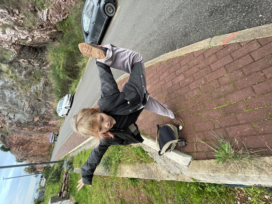 An image taken in Podličak, Montenegro, depicts a young individual, possibly a child or pre-teen, with blonde hair and faint pink streaks, engaged in a balancing pose on a red brick sidewalk. The individual, wearing a black quilted jacket over a black t-shirt and plaid shirt, light grey sweatpants, and brown lace-up boots, stands on their right leg. Their left leg is bent upwards behind them, with the left hand gripping the sole of the left boot. The right arm is extended horizontally to the side. A dark backpack with light tan straps rests on the sidewalk near the subject's right foot. The sidewalk, exhibiting moss growth between the bricks, runs parallel to an asphalt road. A concrete curb separates the sidewalk from an unpaved, grassy area on the left. On the road, a white sedan is visible further in the distance, while a dark grey two-door hatchback is parked closer to the foreground. A boat covered with a blue tarp on a trailer is also discernable further down the road. The background features a steep, reddish-brown rocky hillside with some green shrubbery. The sky is overcast.