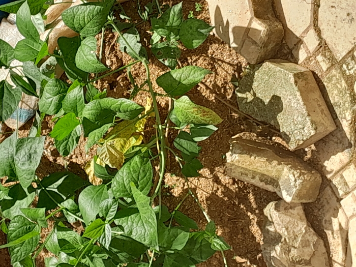 This image depicts an outdoor ground-level scene in Kugbo, Nigeria, under direct sunlight. The lower portion features a paved surface composed of light-colored, interlocking tiles or pavers. Situated on this paving and bordering exposed soil are several irregularly shaped, light-toned concrete or stone fragments. A prominent fragment, positioned centrally, is a broken section of a U-shaped channel or gutter. Another fragment to its right is roughly hexagonal. The upper two-thirds of the image consist of exposed brown soil, from which numerous green plants with broad, ovate leaves and visible vining stems emerge. Some foliage exhibits yellow discoloration, particularly towards the center. Sharp, distinct shadows are cast by the plants and stone fragments onto the ground, indicating bright daylight. No human or animal subjects are present, and no actions or interactions are depicted.