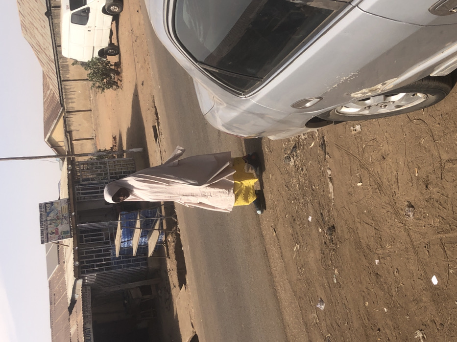 The scene depicts a daylight street view in Kufena, Nigeria. In the foreground on the right, the rear section of a silver sedan car is visible, showing paint damage and flaking on the rear passenger door and fender. The car is stationary on a dirt shoulder. To the left of the car, an individual, appearing female, walks from left to right across the dirt shoulder adjacent to an asphalt road. She wears a light beige or off-white abaya over yellow patterned trousers and dark sneakers. Her face is partially obscured by the abaya's hood. Across the asphalt road in the midground, a series of single-story buildings with corrugated metal roofs are visible. The leftmost building features a barred storefront and a sign displaying "ZE & SONS FASHION STORE" and "POS." Solar panels are mounted on its roof. Empty blue-shelved metal racks stand outside this building. Further right in the background, a light-colored wall encloses a property where a white panel van is parked on a dirt lot. Sparse green vegetation grows near the wall and van. The ground throughout the scene is dry, light brown dirt with scattered debris. The sky is clear and light. A thin, dark pole stands vertically near the center of the image.