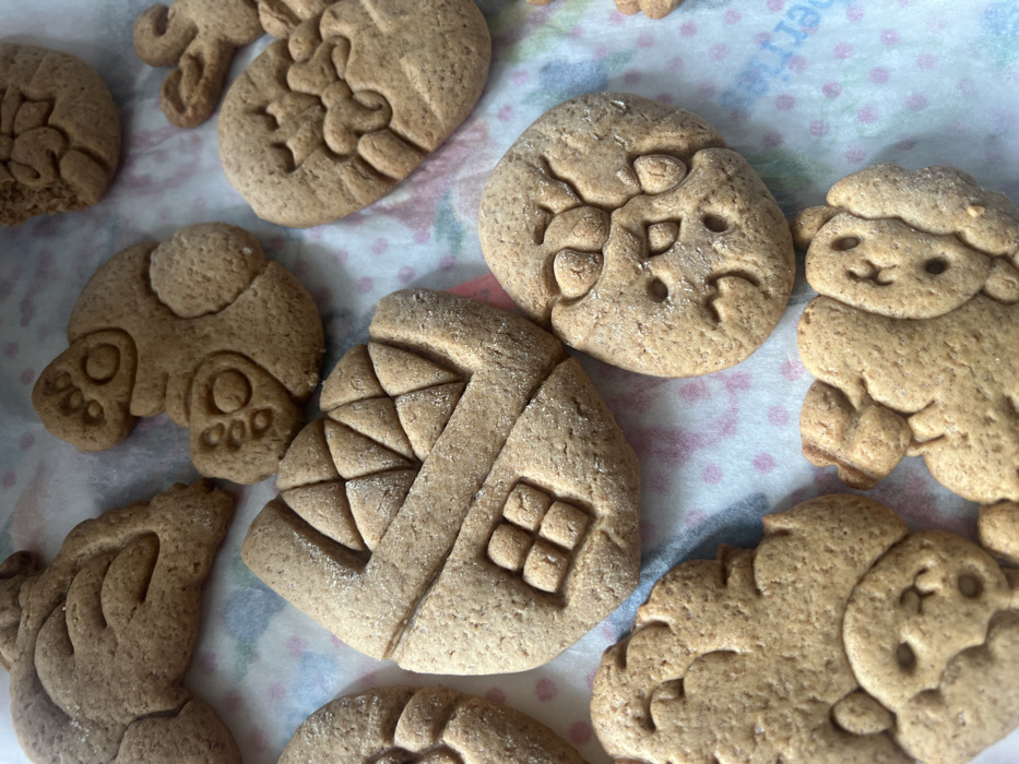 The scene displays multiple homemade, light brown cookies resting on white, patterned baking paper