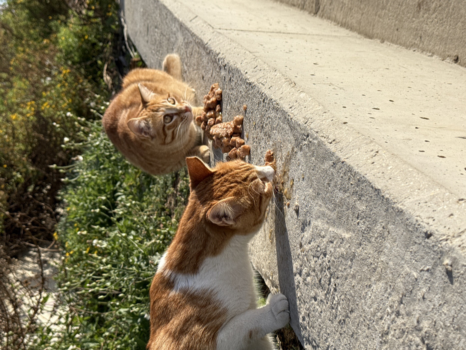 This image, captured in Bat Yam, Israel, depicts two felines on a concrete barrier