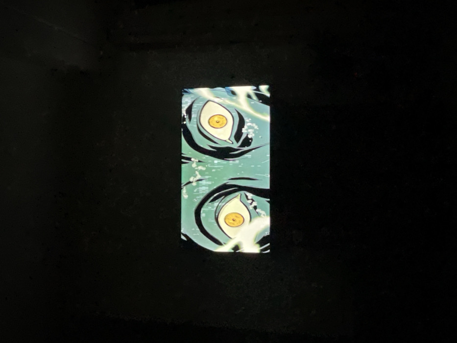 two pairs of wide, stylized eyes. The eyes are rendered in shades of green and black, with striking yellow irises. They are surrounded by what appears to be water or a similar liquid, with visible bubbles and motion lines. The eyes are positioned vertically, one pair above the other, in the center of a predominantly black background. The scene is illuminated, possibly from a screen or light source behind the image.