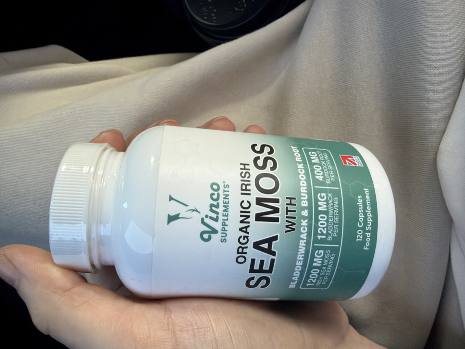 A human hand, visible from the wrist upwards on the left, holds a white plastic supplement bottle with a white ribbed screw cap. The bottle's label is predominantly white and green, displaying the brand "Vinco Supplements" with a logo resembling a 'V' with antlers. The product is identified as "ORGANIC IRISH SEA MOSS WITH BLADDERWRACK & BURDOCK ROOT". Dosage details are present: "1200 MG IRISH SEA MOSS PER SERVING", "1200 MG BLADDERWRACK PER SERVING", and "400 MG BURDOCK ROOT PER SERVING". The label also states "120 Capsules Food Supplement" and includes a "MADE IN BRITAIN" logo. The background consists of light-colored, possibly beige or off-white, creased fabric, likely clothing or upholstery. A dark, indistinct object, potentially a cup or part of a car interior, is partially visible in the lower right. The specific location within the city of Chester, United Kingdom, cannot be determined from the image as it depicts an indeterminate interior setting.
