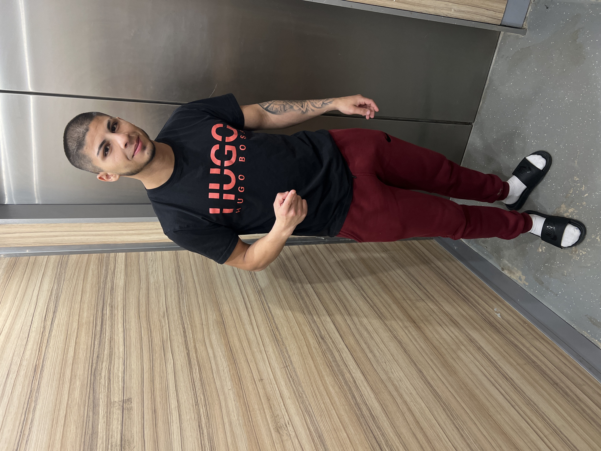 A young man is in what appears to be a small elevator with shiny silver metal walls. He is wearing a black t-shirt with "HUGO BOSS" printed vertically in red on the front, maroon sweatpants, white socks, and black slides. He has short, dark hair and tattoos on his left forearm. The floor in the elevator is a wood-grain design. The location is in a modern building in a city, which may or may not be Sofia, Bulgaria.