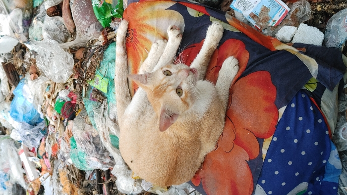 - "A light orange and white domestic cat is positioned on a soiled, patterned cushion amidst a substantial accumulation of refuse in Narayanganj, Bangladesh" by FM-PRZ6s1, licensed under CC BY 4.0