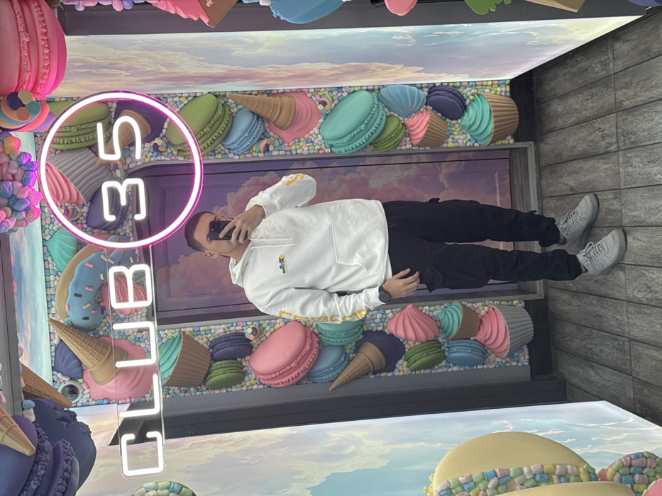 A male individual is depicted taking a mirror selfie inside a highly themed dessert-inspired establishment