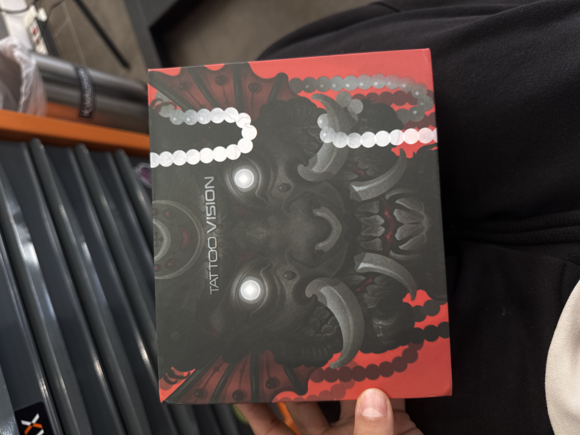 A person is holding a red and black box labeled "TATTOO VISION" with a demonic face design