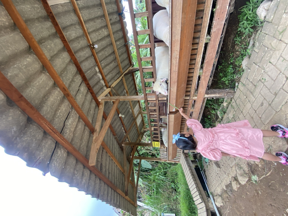 The scene is an animal enclosure in Selotapak, Indonesia. A young child, viewed from the rear, stands on a grey paver walkway. The child wears a light pink ruffled dress, a light blue hair bow, and pink and black athletic shoes. The child extends a green stick or blade of grass with their right hand towards a white sheep or goat within a wooden pen. This animal, with thick white fleece, has its head lowered towards the offered item. The animal enclosure is a wooden structure featuring multiple pens, housing at least three white sheep or goats. The roof consists of corrugated grey panels supported by exposed wooden beams and posts, from which two bare light bulbs hang. A yellow sign with black text is affixed to the wooden barrier to the left of the animals. To the left of the paver walkway, a wooden ramp with horizontal slats descends into dense green vegetation. The background reveals abundant green foliage under a bright, overcast sky.