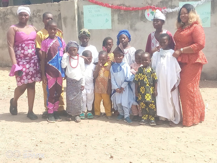 group of people, mostly children, dressed in various traditional African attires. The event appears to be a "Cultural Day," as indicated by a sign on the wall in the background. Two adult women flank the group of children, one on each side. The setting appears to be outdoors, likely a schoolyard, with a simple building visible in the background. The location is presumably in Ajaokuta, Nigeria, given the context provided. The people are posing for a photograph.