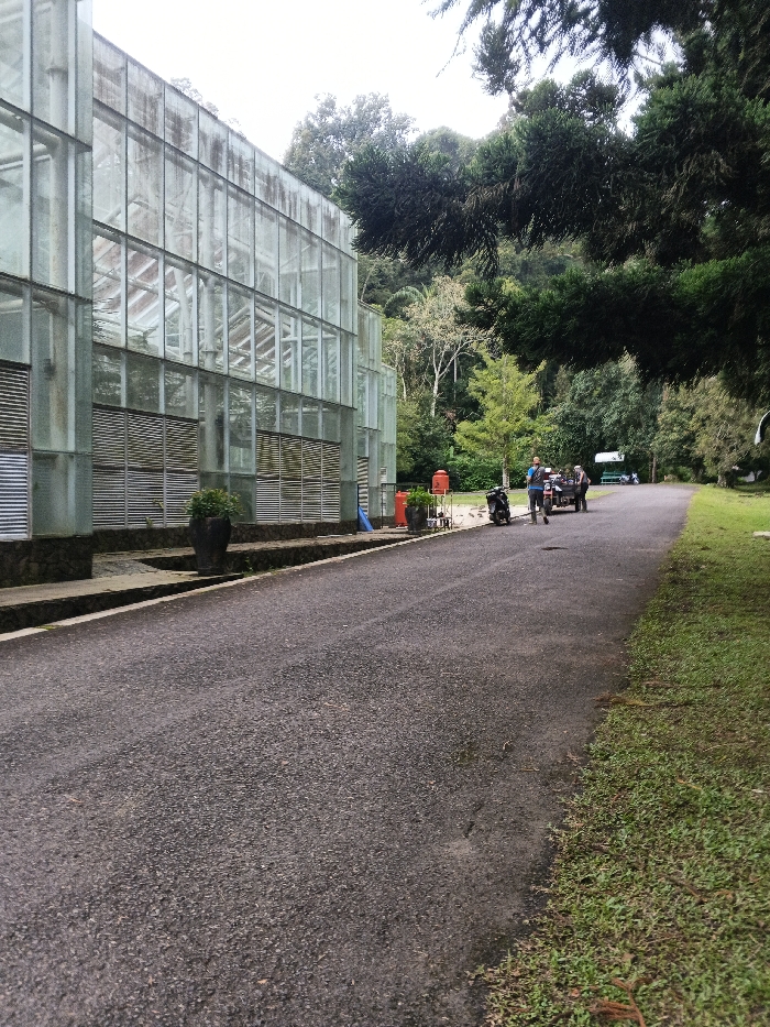 The image displays an asphalt road extending into the middle ground, bordered by green grass on the right and a multi-story, glass-paneled structure on the left. The structure, resembling a large greenhouse, features a modular design with extensive glass sections, metal framing, and horizontal louvers on its lower facade. A dark planter containing green foliage is situated near the building's base. Further down the road on the left, two prominent red cylindrical objects, a dark-colored motorcycle or scooter, and a blue object are visible near the building. Three adult individuals are gathered on the road next to a light-colored three-wheeled utility vehicle with a cargo bed. One person, wearing a blue shirt and dark pants, stands facing the vehicle. The immediate and distant background consists of dense green trees and foliage, indicative of a forested or park-like environment, rising beneath an overcast, light grey sky. A large, dark green conifer branch extends into the frame from the upper right, overhanging the road. The location of Munyati, Zimbabwe, is not ascertainable from the visual elements within the image.