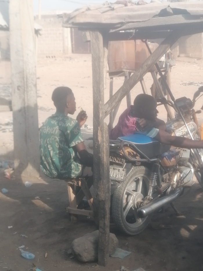 Two people sit under a wooden shelter next to a motorcycle. One person sits on a bench, facing left, with a small item in their hand near their mouth. They wear a green patterned shirt. The other person leans against the motorcycle, facing right, wearing a purple shirt. The motorcycle is dirty and has a blue seat. The area around them appears dusty with some trash on the ground. A utility pole is visible on the left side of the frame.