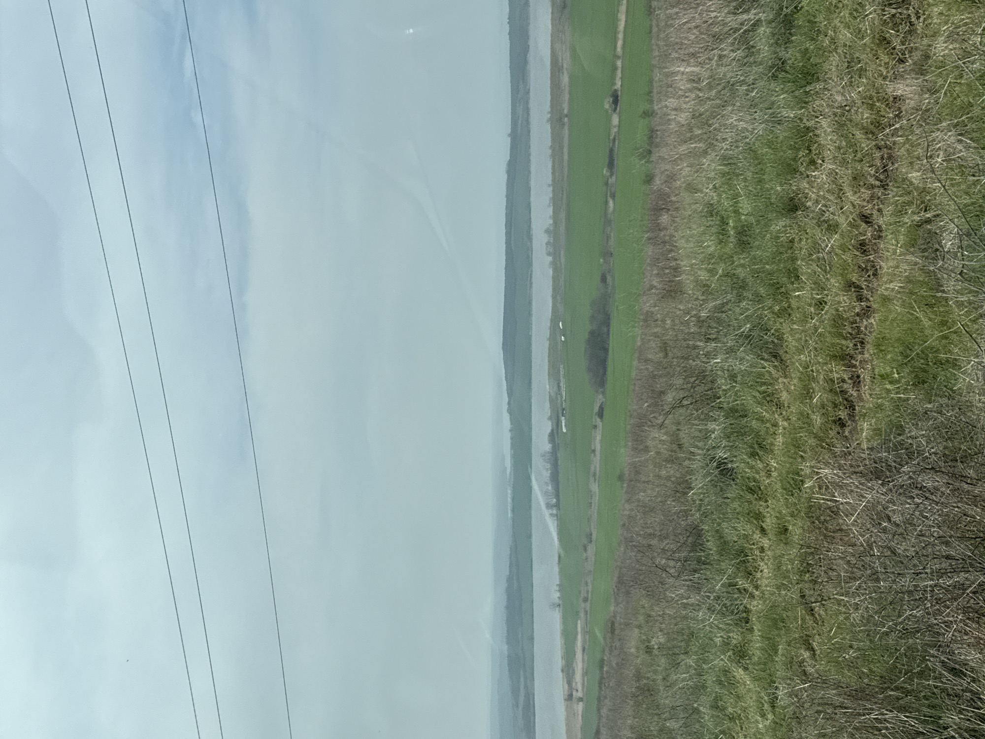 The image presents a panoramic view of a rural landscape from an elevated perspective, situated near Tvarditsa, Bulgaria. The upper third of the frame shows an overcast, hazy, light blue-grey sky, bisected by three dark, horizontal power lines. A small, dark, indistinct object, possibly an avian entity, is visible in the upper left sky quadrant. The middle ground features a wide, light grey body of water, likely a lake or reservoir, stretching horizontally across the scene. Beyond this water, a darker, forested landmass or low hills are visible, partially obscured by atmospheric haze. Immediately in front of the water, verdant green agricultural fields are present, punctuated by two small, white, rectangular objects (possibly structures or hay bales) positioned on the left side near the water's edge. A faint, light-colored path or dirt road traverses these fields and extends towards the water on the right. The foreground, occupying approximately the lower half of the image, consists of dense, uncultivated vegetation. This area is dominated by dry, light brown and grey grasses and bare brush, interspersed with patches of greener grass. No human subjects, animals (other than the potential distant bird), or direct interactions are visible. The scene depicts a temperate environment under a muted, overcast sky.