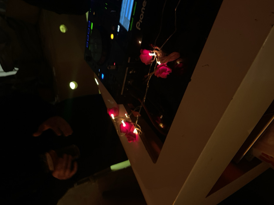 The image displays a dimly lit indoor environment, consistent with an entertainment venue such as a club or bar in Moscow, Russia. The specific address or district within Moscow is not discernible from the visual evidence. In the foreground, a white, angular DJ booth or counter is prominently featured. Situated on this counter is a black Pioneer DJ controller/mixer, actively displaying various illuminated buttons and a blue-lit screen. A string of decorative lights, featuring small red rose-shaped floral covers, is draped across the white counter and partially over the DJ equipment, with several of the roses glowing warmly. In the upper left quadrant, a person is partially visible from the chest down, clad in dark clothing. This individual is holding a clear glass containing a beverage in their right hand, while their left hand is open in a slight gesture. The background is dark and out of focus, exhibiting several blurred circular lights, indicative of additional ambient lighting within the space. No direct interactions between individuals are visible.