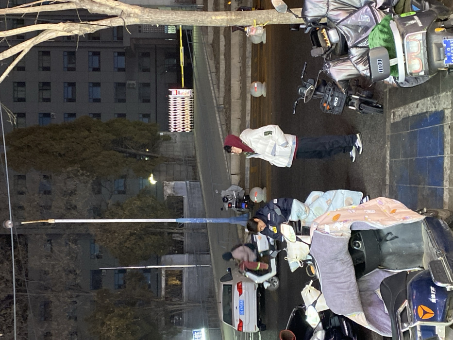 The image depicts an urban street scene at night in Zhongtun, China. The environment includes an asphalt road, a sidewalk with blue and grey tiles, and several streetlights. In the background, a large, multi-story building with numerous windows is dimly visible, along with several trees, some appearing bare. A retractable, diamond-patterned security gate and a yellow barrier arm are present across a driveway in the mid-ground right. Several spherical concrete bollards with white and orange markings line the street's edge. Three individuals are present. In the immediate foreground, a male, appearing young adult, is seated on a dark blue electric scooter, looking downwards. He wears a dark blue padded jacket with yellow accents. Adjacent to him, a second male, also appearing young adult, stands upright, facing left. He wears a white puffer jacket over a red hooded sweatshirt, dark pants, and sneakers. In the mid-ground left, a third individual, obscured by a white sedan (license plate "苏 D K9086"), is operating a white electric scooter and moving leftward. Multiple electric scooters and motorcycles are parked or present. In the foreground, two electric scooters are visible: one dark blue, partially covered by a light grey and light blue blanket, and another dark one on the right covered by a silver-grey tarp and a green blanket (license plate "苏 D409293"). Another scooter is parked near the white sedan in the mid-ground left, and another, covered in grey, is near the bollards in the mid-ground right.