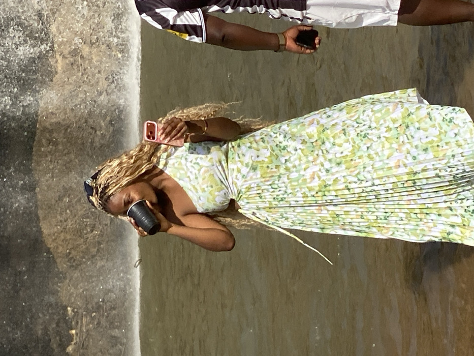 In Kukum, Nigeria, an outdoor scene shows two individuals standing in shallow, murky brown water, with a waterfall or strong rapids visible in the background. An adult female, centrally positioned, possesses long, blonde, braided hair and wears a one-shoulder, light green and white floral patterned pleated maxi dress. Sunglasses are perched on her head. She is actively drinking from a black disposable cup held to her mouth with her right hand, while simultaneously holding a pink smartphone in her left hand. A gold-colored bracelet is present on her left wrist. To her right, partially visible, is an adult male wearing a black and white striped short-sleeved shirt and white shorts. His right arm, adorned with a wrist-worn watch, is visible, holding a black smartphone. The background features a significant body of water with a waterfall generating mist and foam under bright daylight conditions.