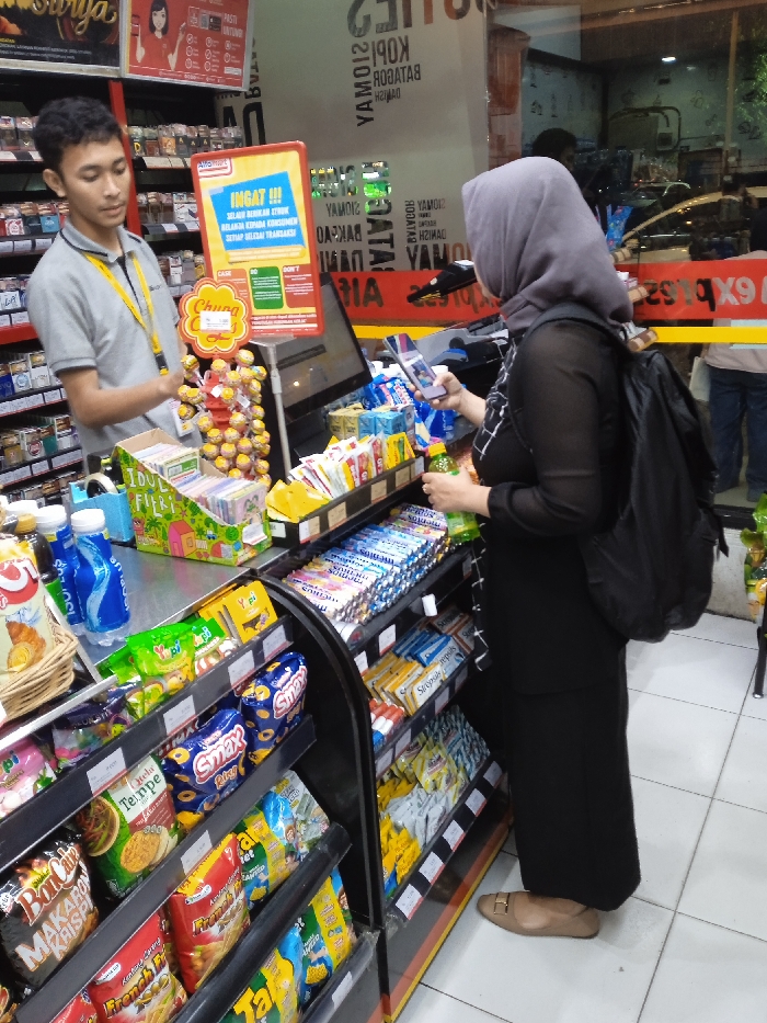 This image depicts an indoor scene within an Alfamart convenience store in Semarang, Indonesia. A young adult male cashier, wearing a grey polo shirt and yellow lanyard, stands behind a silver counter, facing a female customer. The customer, wearing a grey hijab, sheer black long-sleeved top, black trousers, and light brown flats, has a black backpack. She holds a green plastic bottle in her right hand and a smartphone in her left, displaying a screen, likely for a mobile transaction or loyalty program. The counter features a red-framed "Alfamart" sign with Indonesian text (e.g., "INGAT!!!" - Remember!!!), a "Chupa Chups" lollipop display, and various small packaged goods. Adjacent shelves are fully stocked with an assortment of snacks, including chips (e.g., "Smax," "Tempe," "Makaroni Krispi") and beverages. A cash register or point-of-sale system screen is visible on the counter. The background shows reflections in a large glass window, revealing reversed text (e.g., "KOPI," "BATAGOR") and indistinct figures outside. The store has bright overhead lighting and a white tiled floor. The interaction appears to be a routine retail transaction.