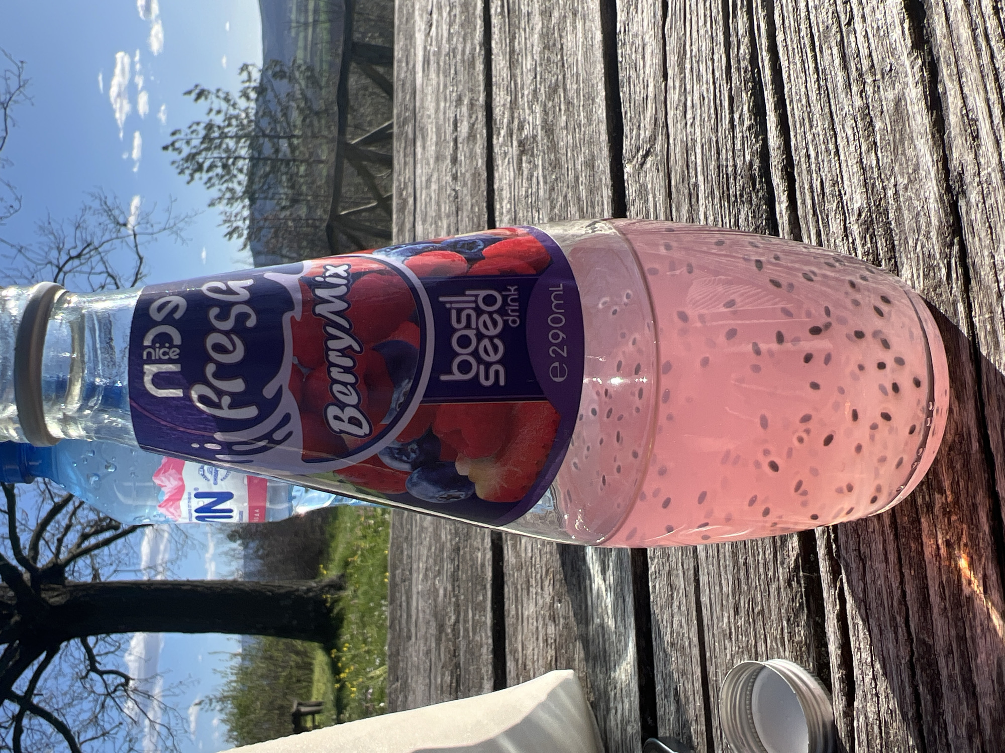 A tilted, medium shot of a bottle of "nice! fresh" Berry Mix basil seed drink with visible basil seeds inside. The bottle sits on a weathered wooden surface, possibly a picnic table, outdoors. A blue water bottle is partially visible behind it. In the blurred background, there is greenery and a tree, and further in the distance, a hilly landscape is visible under a sky with scattered clouds. There is no evidence to confirm the location as Kormiansko, Bulgaria.