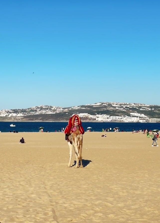 beach on a sunny day. Two camels, both saddled with red cloth, are on the beach. One camel is standing, the other is sitting. A person in a long brown coat and straw hat is standing on the sand nearby. In the background, the ocean meets the shoreline, lined with many sunbathers. A cityscape sits on a hill behind the beach, with many white buildings visible. The sky is clear and blue.