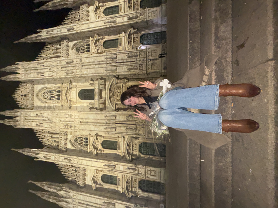 A nighttime photograph depicts a young female seated on stone steps directly in front of the illuminated facade of the Milan Cathedral (Duomo di Milano) in Milan, Italy. The female subject, positioned centrally and facing the camera, has dark hair and a smiling expression. She is dressed in a dark top, light blue jeans, a long brown or khaki overcoat, and brown pointed-toe boots. Her hands are raised, forming "peace" signs. On her lap, she holds a white floral bouquet wrapped in paper with a white ribbon, and a small, clear plastic container. The intricate Gothic architecture of the cathedral, featuring numerous spires, statues, and windows, dominates the background under a dark sky. Several cigarette butts are visible on the stone steps around the subject. Two indistinct human figures are faintly discernible near a large doorway on the lower right section of the cathedral's facade.