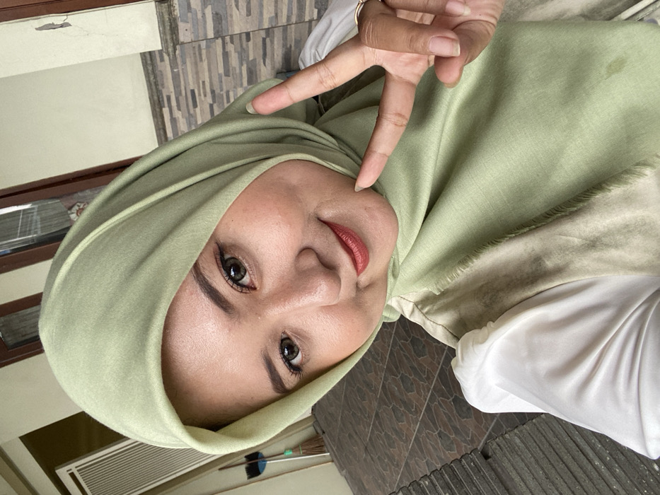 A woman wearing a light green hijab is pictured in a close-up shot. She is making a peace sign with her hand, with one finger touching her cheek. She has fair skin, dark eyes, and red lipstick. The background is a mix of beige wall and brown tiled flooring. A window with white blinds can be seen partially in the distance. The photo is slightly rotated counter-clockwise.