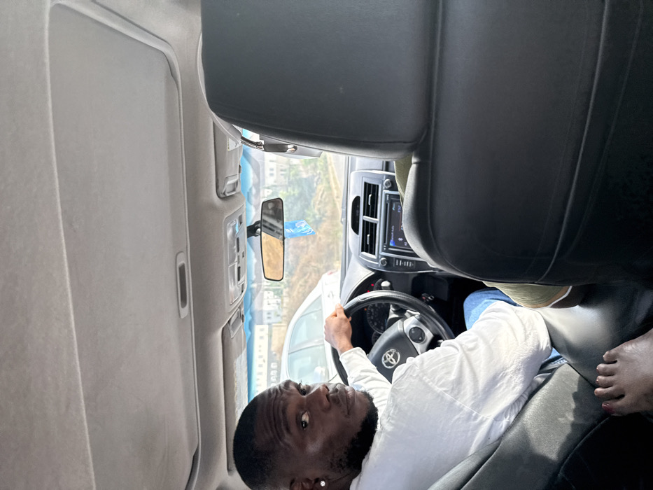 The scene is captured inside the passenger compartment of a Toyota vehicle, likely a Camry model, in Lugbe, Nigeria