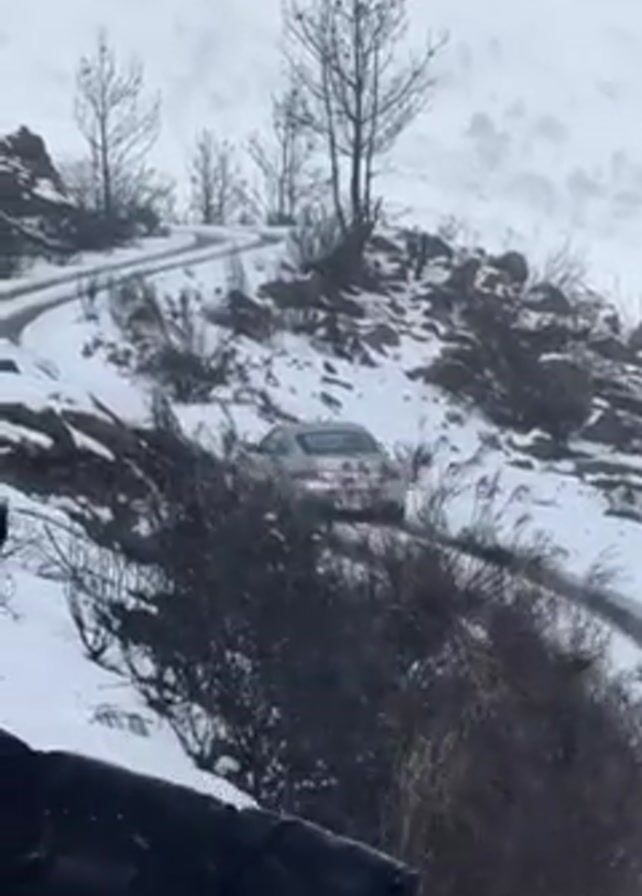 A silver or light gray car is driving on a snow-covered road in a mountainous area. The road is winding and narrow, and there are trees and shrubs on either side, some appearing burnt or dead. The weather appears snowy, and the visibility is somewhat limited. The car moves away from the camera, traversing the snow-covered terrain. The camera is in a fixed position and captures the car's movement up the mountain road.