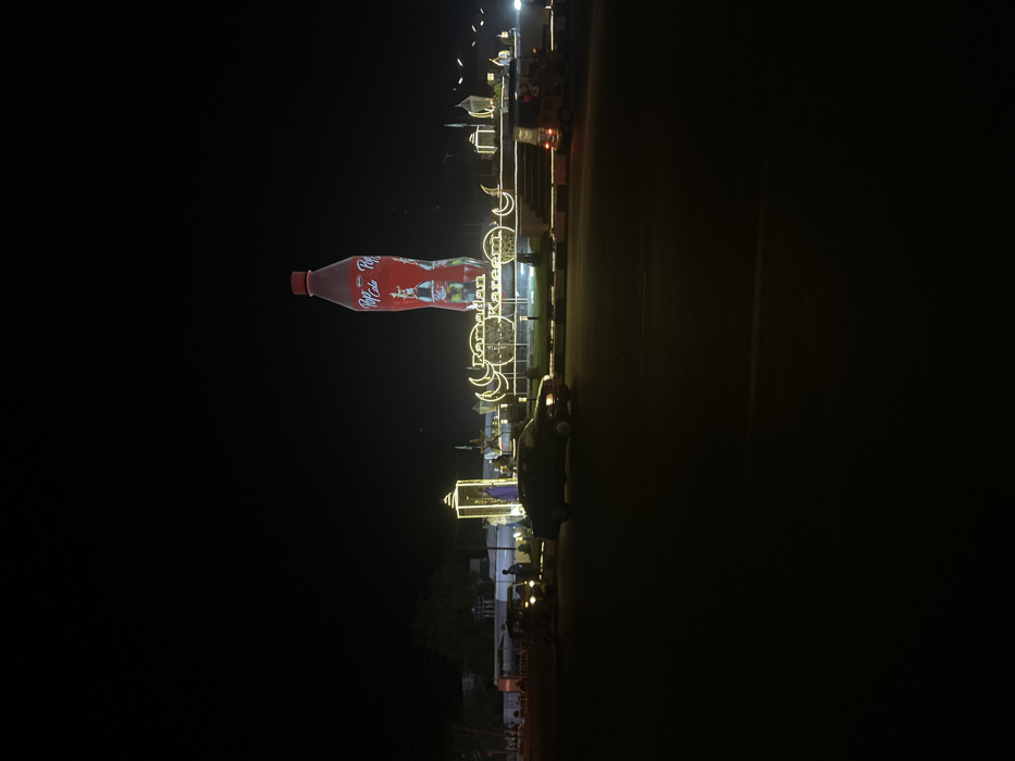 The image displays a nighttime scene at a city roundabout in Giginyu, Nigeria. A prominent, large, illuminated red Pop Cola bottle monument, featuring the brand logo, stands at the center of the roundabout. Below the bottle, a white, illuminated structure spells out "Ramadan Kareem" in stylized script, flanked by illuminated crescent moon and star motifs. This structure and other surrounding geometric decorative elements are outlined with warm yellow lights. On the left side of the road circling the roundabout, a dark-colored sedan with illuminated headlights is visible. On the right, a lighter-colored three-wheeled vehicle, possibly an auto-rickshaw, is present with its lights on. Several indistinct human figures are discernible near the illuminated structures. The sky above is dark, and the immediate foreground consists of an unlit asphalt road surface.