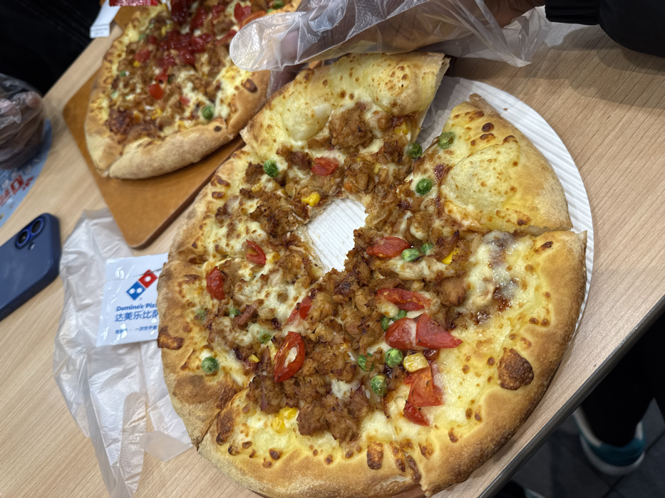 - "The scene depicts two pizzas laid out on a light-colored wooden table, indicative of a dining area in Daxing District, China" by FM-CLEdw1, licensed under CC BY 4.0