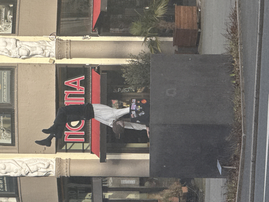 A male individual performs a handstand on a dark grey, roughly cubic concrete block in an urban environment in Wuppertal, Germany. The concrete block, approximately one meter high, is situated on a sparse patch of ground adjacent to an asphalt street. The individual, wearing a white long-sleeved shirt, black trousers, and black socks, is inverted with his hands placed on a black, sticker-covered case or box atop the concrete block. His head is visible, facing towards the right. In the background, a light-colored, multi-story building displays a red "NONNA" neon sign above a red awning. Text on windows above the awning reads "zahnärzte im sassehaus," indicating the Sassehaus building as the specific location. Two ornate white classical columns with sculpted figures are integrated into the building's facade, flanking the area above the awning. Anti-bird spikes are visible along the ledge directly above the red awning. To the right of the concrete block, a small potted palm tree stands in a wooden planter equipped with wheels. Dry vegetation and small shrubs are scattered around the base of the concrete block and along the curb separating it from the street. A small, light-colored sign on a thin pole is partially visible in the vegetation directly in front of the concrete block.