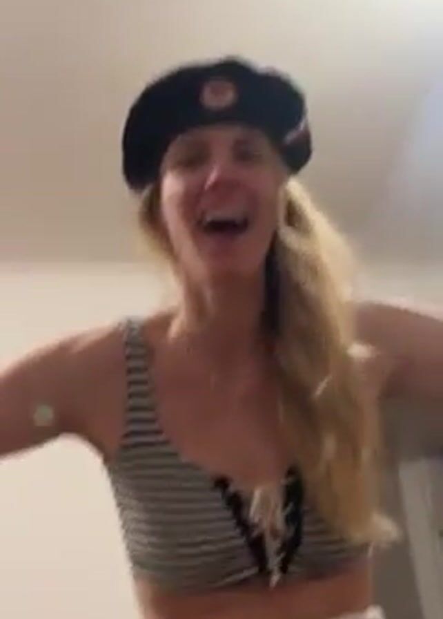 A fair-skinned woman with long, blonde hair is centered in the frame. She wears a black beret with a red and white emblem, a striped crop top, white pants with a black belt, and is standing indoors in a room with white walls. The woman is smiling, looks excited and yells “Team USA”. Several potted plants, and a wooden piece of furniture, are visible in the background.