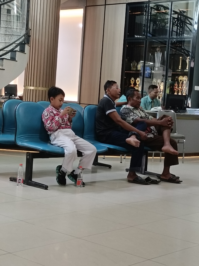 This image displays an indoor waiting area in Margorejo, Indonesia, characterized by a light-tiled floor and modern architectural elements. In the foreground, a young boy, wearing a red and white patterned long-sleeve shirt, white trousers, and black sneakers, sits on a blue waiting chair, engrossed in a light-colored smartphone held horizontally. Two plastic ADES water bottles with red caps are positioned on the floor near his feet. Adjacent to the boy, a middle-aged man in a dark polo shirt and jeans sits barefoot on another blue waiting chair, with his left foot resting on his right thigh, gazing towards the right side of the frame. To his right, an older man in a patterned short-sleeve shirt and brown trousers sits barefoot on a grey chair, his hands clasped, also looking to the right. A pair of brown sandals rests on the floor in front of the older man. The background on the left features a spiraling staircase with dark railings and vertical wooden paneling beside a tall, illuminated light panel. On the right background, a large, dark-framed glass display case holds numerous trophies and awards. Behind this case, a man in a light green shirt and tie is seated at a desk, partially obscured, with a computer monitor visible.