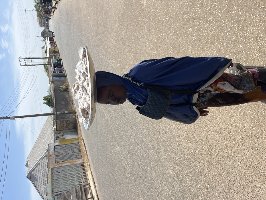 A young child is depicted standing on an asphalt road under a clear sky during daytime in Jos, Nigeria. The child, wearing a dark blue head covering and garment, balances a large, silver-colored metal tray on her head. The tray contains numerous small, irregularly shaped items, each individually packaged in clear plastic bags. A black quilted shoulder bag with a silver chain strap is worn across her body. Her lower body shows colorful patterned trousers beneath the blue garment. To the left, a light-colored building with a corrugated grey roof features a large, rusty metal accordion gate and a smaller faded yellow gate. A wooden structure is partially visible on the far left. The road extends into the distance, appearing to curve slightly uphill, lined on the right by various structures, including buildings and a concrete wall topped with barbed wire. Utility poles with overhead power lines are visible along the street. In the background, further down the road, several individuals and at least one motorized tricycle (keke napep) are discernible, indicating a populated area.
