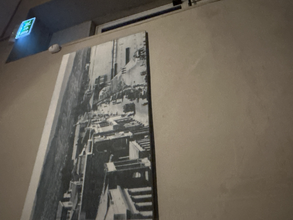 A large, landscape-oriented, black-and-white historical photograph is prominently displayed on a light beige wall in an indoor setting. The photograph captures an elevated, panoramic view of the old waterfront in Limassol, Cyprus, likely depicting the area around Akti Miaouli or the Old Port during the early to mid-20th century. Within the photograph: * **Left and Center**: A dense urban area is visible, characterized by multiple-story buildings lining a wide street. One structure in the lower left foreground features distinctive neoclassical architectural elements, including prominent columns. * **Street**: The street is active, populated by numerous pedestrians, several horse-drawn carriages, and what appear to be early model automobiles, indicating a bustling commercial or social hub. * **Right**: A clear waterfront area features a promenade or pier extending into the calm sea, with multiple individuals visible on it. * **Background**: Distant hills or low mountains are discernible beyond the cityscape and across the water, consistent with Limassol's geographical backdrop. The immediate environment surrounding the photograph includes: * **Wall**: The wall is a plain light beige/tan. * **Upper Right**: A brightly illuminated green "EXIT" sign with white lettering is mounted on an angled wall or ceiling junction. Below it, a small, white, circular device, possibly a smoke detector or motion sensor, is affixed to the wall. * **Right Edge**: A dark vertical element, consistent with a door or window frame, is visible. The overall lighting suggests a dim interior space.