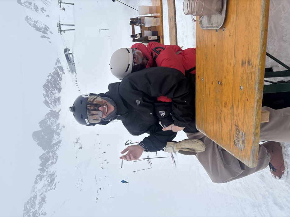 This image depicts an outdoor scene in a snow-covered mountain environment, identified as the city of Klösterle, Austria. Two individuals are seated at a rustic wooden picnic table partially covered in snow. The prominent individual in the foreground, male, wears a black ski jacket, light brown ski pants, and brown ski boots. He is equipped with a black Bern ski helmet featuring a mounted action camera, mirrored Oakley goggles, and a grey neck gait. A white substance is visible on his nose and upper lip. He holds a lit cigarette in his right hand. A beige mitten hangs from his left wrist. The second individual, positioned behind and embracing the first, wears a red ski jacket and a light grey ski helmet with goggles. On the table, to the right, are two empty glass mugs on a small wooden tray. Behind the individuals, another wooden bench or table holds a wooden crate containing multiple dark bottles, one of which appears to be Coca-Cola, alongside several clear plastic cups. Ski poles are visible in the snow to the left of the table. In the background, a vast snow-covered mountain range with jagged peaks is visible under an overcast sky. Skiers are discernible on a snow-covered slope, and a ski lift station with multiple support towers extends into the distance. The wooden table displays a "Stiegl" brand logo.
