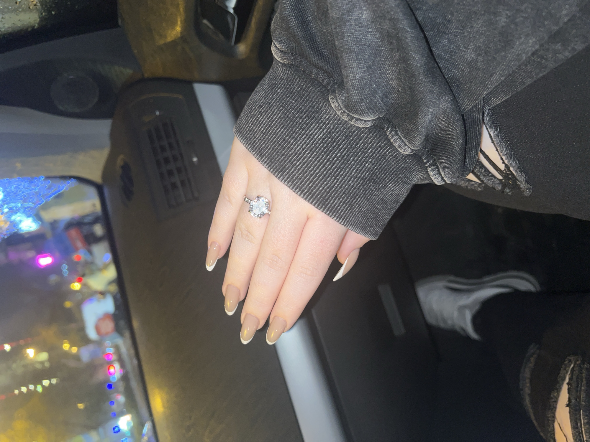 The image depicts a close-up view from within a vehicle at night in Bayraklı, Turkey. A person's left hand, featuring manicured nails with a neutral base and white tips, is positioned in the center-right. A silver-colored ring with a prominent oval-cut clear stone and smaller accent stones is worn on the ring finger. The hand emerges from a dark grey, ribbed long-sleeved garment. In the lower-left, a portion of the person's leg is visible, dressed in dark, distressed jeans with a rip on the thigh, and a white athletic shoe. The dark dashboard of the vehicle is visible across the foreground. Through the windshield, a blurred exterior city scene is apparent, illuminated by numerous scattered, colorful lights (red, blue, yellow, white, magenta), suggesting streetlights, traffic signals, or building lights. Moisture or rain droplets are visible on the windshield surface.
