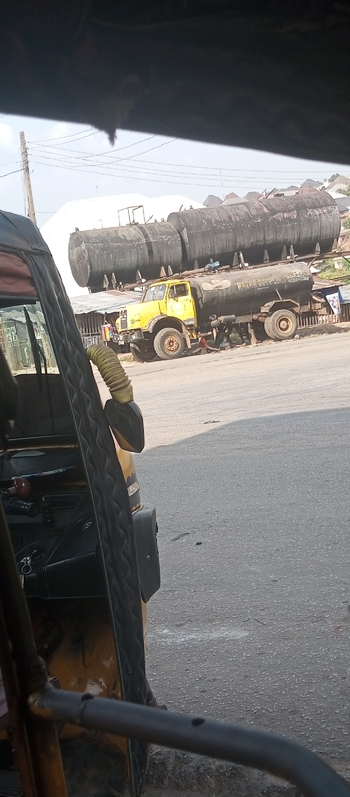A yellow truck carrying two large, black cylindrical tanks is parked on the side of a street. The truck appears to be a water tanker, with "Water Supplier" written on the side. A three-wheeled vehicle, possibly an auto-rickshaw, is partially visible in the foreground, obscuring some of the view of the street and truck. Buildings and utility poles can be seen in the background, under a bright, hazy sky.